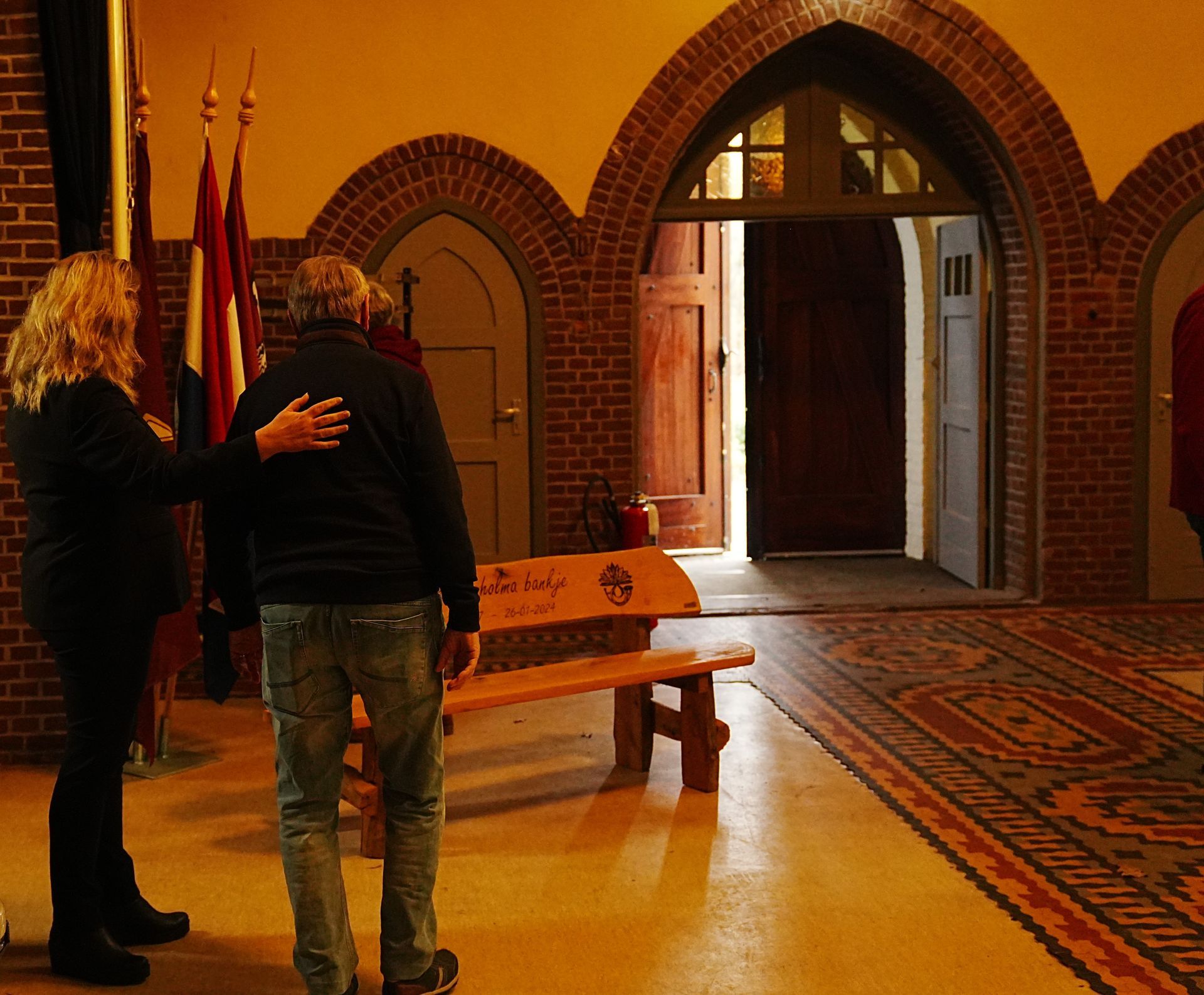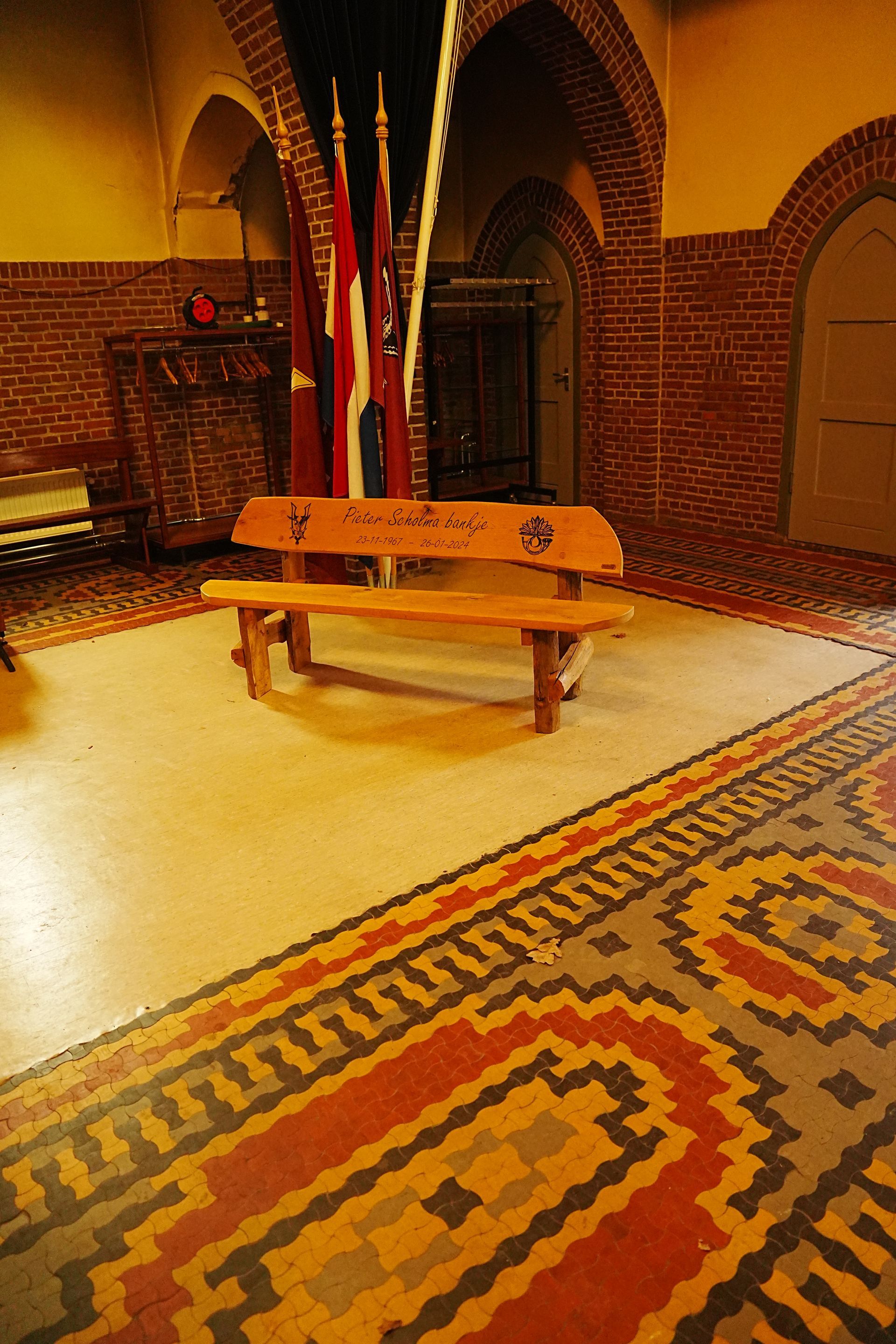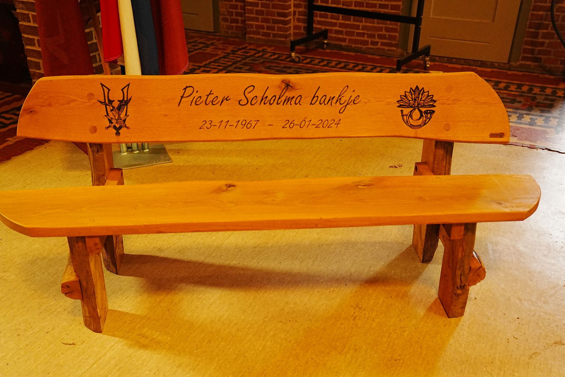 De gelden die op uitdrukkelijke wens van Pieter Scholma na zijn overlijden aan de VVGJ geschonken zijn, zijn besteed aan het zgn Pieter Scholma Bankje. In bijzijn van zijn naasten en kameraden is in de kapel het bankje officieel onthuld en is uitgebreid bij Pieter stil gestaan. Een schitterend en gedenkwaardige besteding van de bijdrage. Een plek om te zitten en te herdenken. Helaas gaat dat voor hem niet meer op, maar mocht u er een keer zitten, denk dan dat dat mogelijk is gemaakt door Pieter.